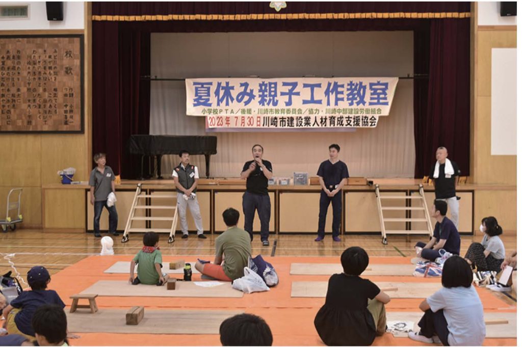 技連協の行事では、「技能職者に学ぶ」に、中原区の玉川中学校や幸区の南河原中学校、日吉中学校で建築大工職の講師として参加しました。
