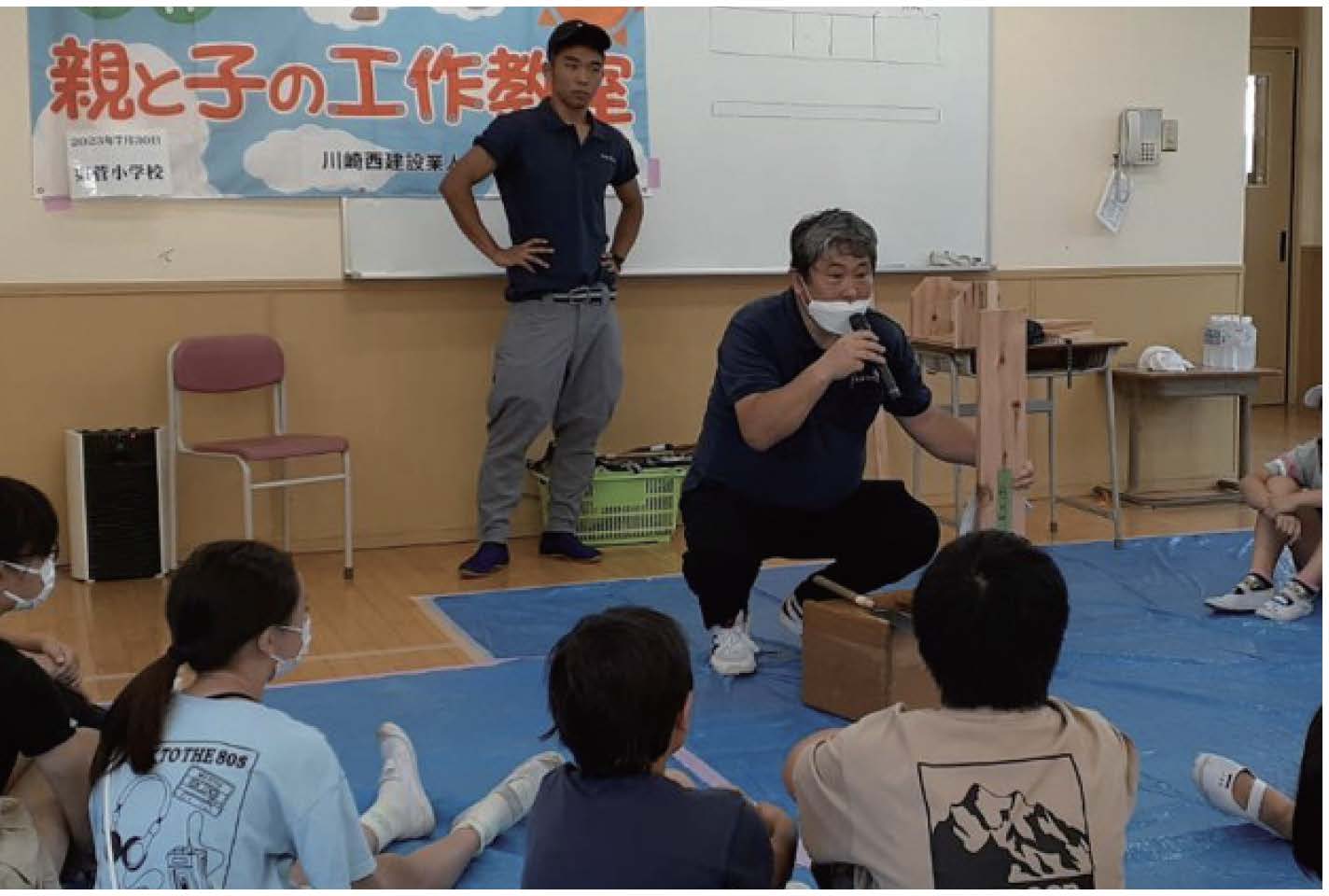 神奈川土建では、建設業のアピールと将来の建設業の後継者づくりを目的に「夏休み親と子の工作教室」に取り組んでいます。昭和62(1987)年に、当時の川崎支部が2校で始めたのが第1回目。建設組合が小学校で実施するスタイルは全国初の取り組みでした。2年間新型コロナのため実施でき ま せんでしたが、昨年再開して今年で35回目。令和5(2023)年度は12校で185人の児童が参加しました。