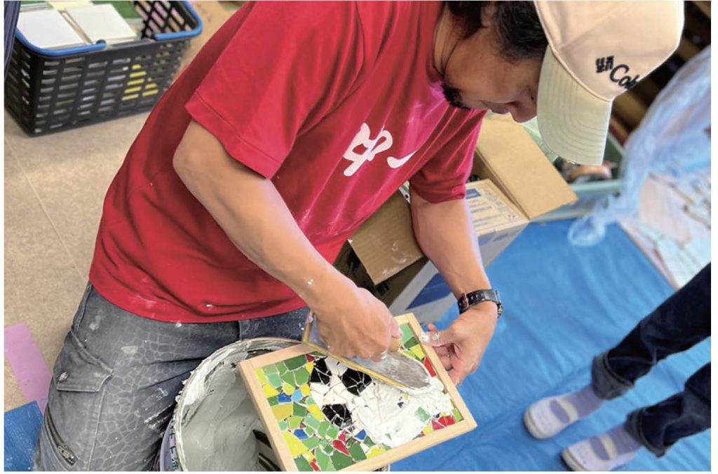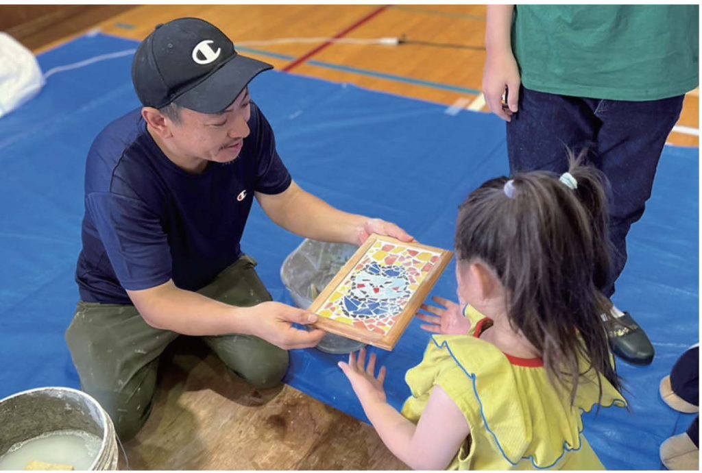 毎年、川崎区と幸区の小学校で「夏休み親子工作教室」を開催し、子どもたちにエ作の楽しさを伝える取組も行っています。木工作では、のこぎりや金づちの正しい使い方を教え、お父さんやお母さんと一緒に作品を作り上げてもらいます。タイル工作では、それぞれが考えてきたデザインにあわせて割ったタイルを貼ってもらい、仕上げに組合の職人が隙間に目地を詰めてきれいに仕上げます。親子でチカラをあわせてがんばる過程が良い思い出になっているようです。