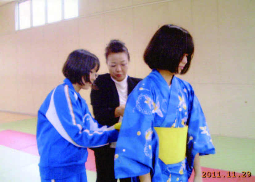 川崎市技能職団体連絡協議会が行う後継者育成事業「技能職者に学ぶ」で、川崎市内の中学校での体験講習を行っています。二人一組で着せ合う事や、帯結びを体験し、着物のたたみ方を学び、着物の種類と、用途を楽しく学べる工夫を取り入れて行っています。